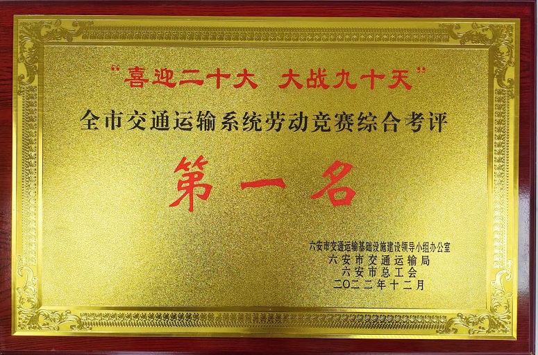 近日,公司在六安市交通運輸局和六安市總工會組織的“喜迎二十大、大戰(zhàn)九十天”全市交通運輸系統(tǒng)勞動競賽綜合考評中獲第一名。同時參與建設(shè)的S244羅崗至分路口段公路工程(二期)03合同段項目和G237六安馬頭至舒城萬佛湖工程(一期)項目在勞動競賽中被評為“優(yōu)秀施工單位”。